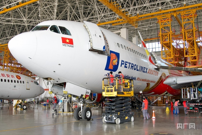 海南自贸港一站式飞机维修产业基地工作人员对进境飞机执行检修(央广网记者 蔡文娟 摄)